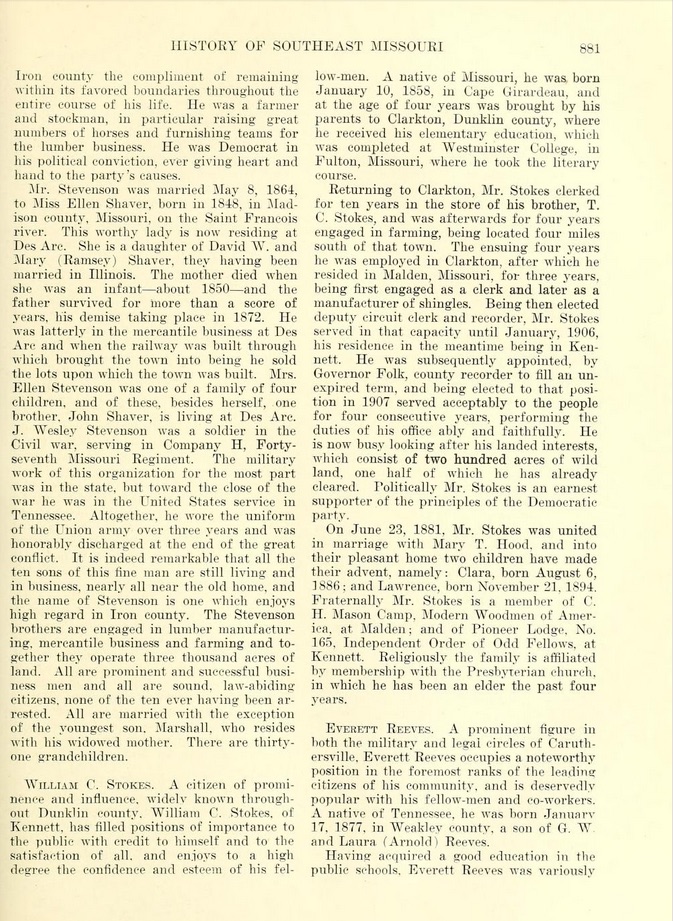 Mr. Stevenson was married May 8, 1864, to Miss Ellen Shaver, born in 1848, in Madison County, Missouri, on the Saint Francois River. This worthy lady is now residing at Des Arc. She is a daughter of David W. and Mary (Ramsey) Shaver, they having been married in Illinois. The mother died when Ellen was an infant in about 1850 and the father survived for more than a score of years, his demise taking place in 1872. He was latterly in the mercantile business at Des Arc, and when the railway was built through which brought the town into being he sold the lots upon which the town was built. Mrs. Ellen Stevenson was one of a family of four children, and of these, besides herself, one brother, John Shaver, is living at Des Arc. J. Wesley Stevenson was a soldier in the civil war, serving in Company H, Forty Seventh Missouri Regiment. The military part of this organization for the most part was in the state, but toward the close of the war he was in the United States service in Tennessee. Altogether, he wore th
