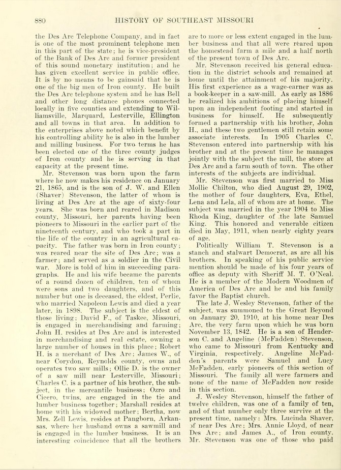 The J. Wesley Stevenson, father of the subject, was summoned to the Great Beyond on January 20, 1910, at his home near Des Arc, the very farm upon which he was born November 13, 1832. He is a son of Henderson C. and Angeline (McFadden) Stevenson, who came to Missouri from Kentucky and Virginia, respectively. Angeline McFadden's parents were Samuel and Lucy McFadden, early pioneers of this section of Missouri. The family all were farmers and none of the name of McFadden now reside in this section.