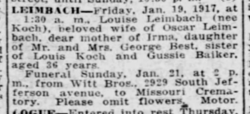 Leimbach, Louise nee Koch Obit STL Post Dispatch 21 Jan 1917 pg 35