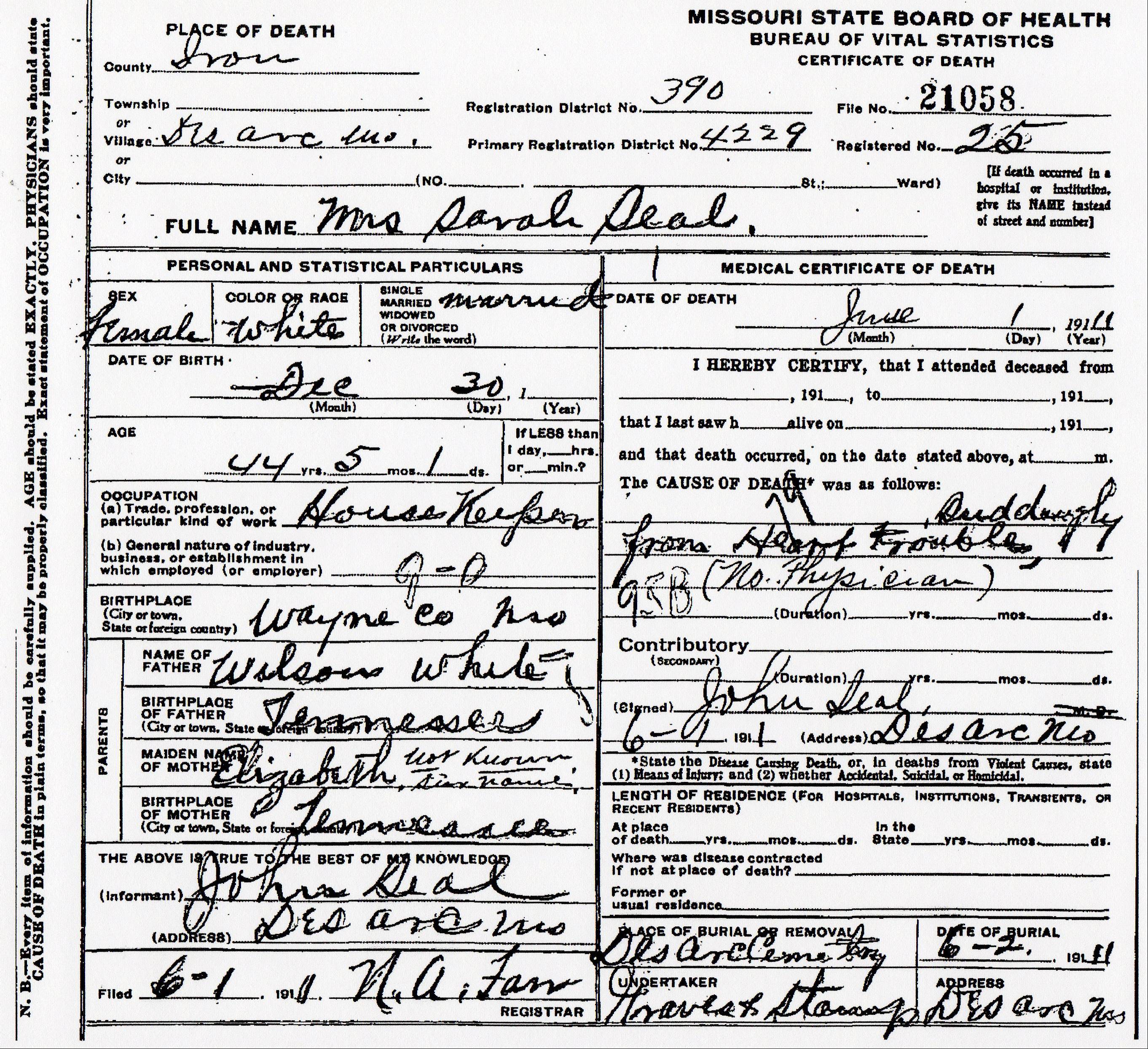 | | 2. Macey Erbina Seal, b. 31 Jul 1900, Des Arc,,Iron County,Missouri,USA d. 23 Oct 1984, Park Hills,,Saint Francois County,Missouri,United States (Age 84 years) |