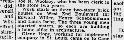 Work starts on three two-story brick houses on West End Boulevard for Edward Willer, Henry Scheppelmann, and Louis Ische. The three young men married sisters, so each are building a home alike in structure.
