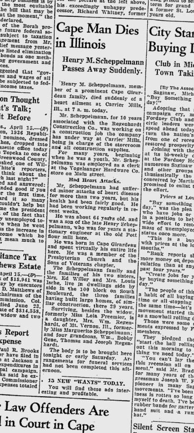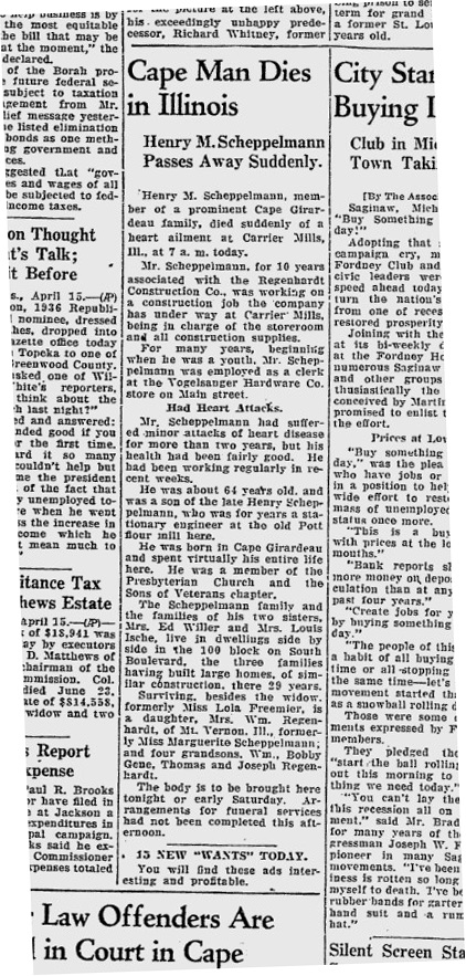 Henry M. Scheppelmann, member of a prominent Cape Girardeau family, died suddenly of a heart ailment at Carrier Mills, Ill., at 7 a.m. today. Mr. Scheppelmann, for 10 years associated with the Regenhardt Construction Co., was working on a construction jobthe company has underway at Carrier Mills, being in charge of the storeroom and all construction supplies. For many years, beginning when he was a youth, Mr. Scheppelmann was employed as a clerk at the Vogelsanger Hardware Co. store on Main Street.