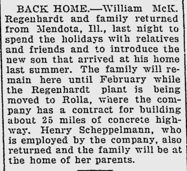 Relatives from out of town here for the funeral included a son-in-law and daughter, Mr. and Mrs. William Regenhardt of Mount Vernon, Ill.