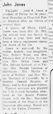 - Beulah May Jones was born on July 2, 1913, in Chico, California. her father was Shedrick J. Jones Jr., and her mother was Marguerite Treasia "Maggie" O'Brien. She married Floyd Ray Lehman on July 3, 1935, in Fallon, Washoe County, Nevada. She passed on August 18, 1973, in Reno, Washoe County, Nevada, at the age of 60, and was interred at Churchill County Cemetery, Fallon, Churchill County, Nevada, USA.