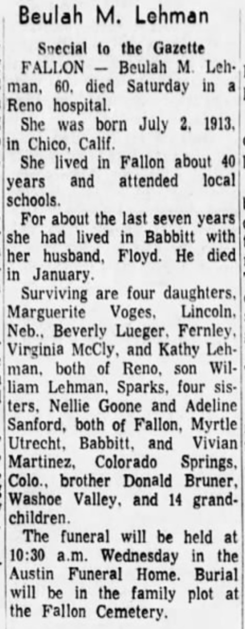 Beulah M Lehman nee Jones Obit Reno Gazette-Journal 20 Aug 1973