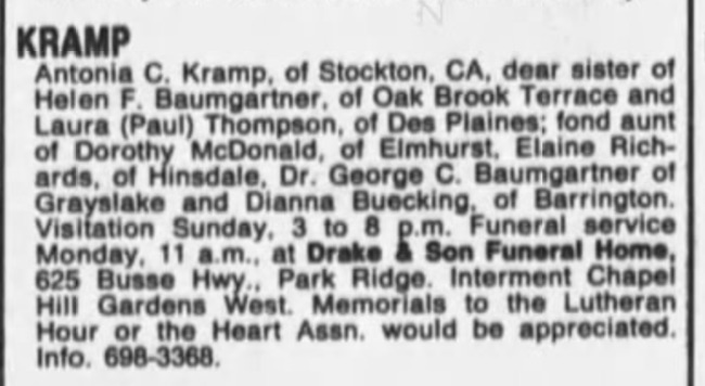 Antonia C. Kramp Obit Chicago Tribune 28 Oct 1989 Section 1 pg 13