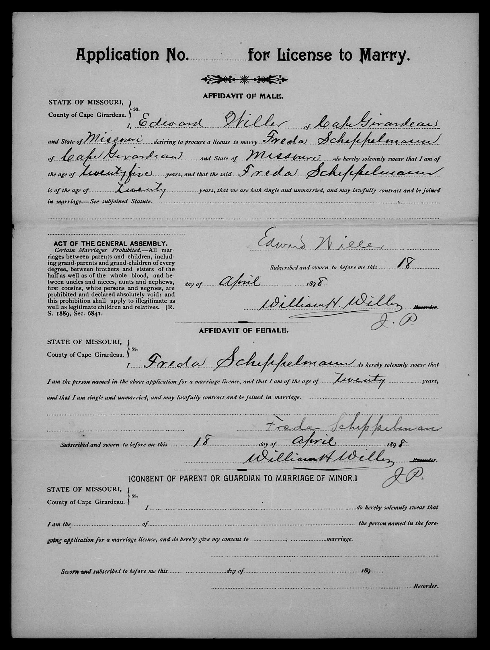 | Freda Scheppelman to Edward Willer Marriage License Application |