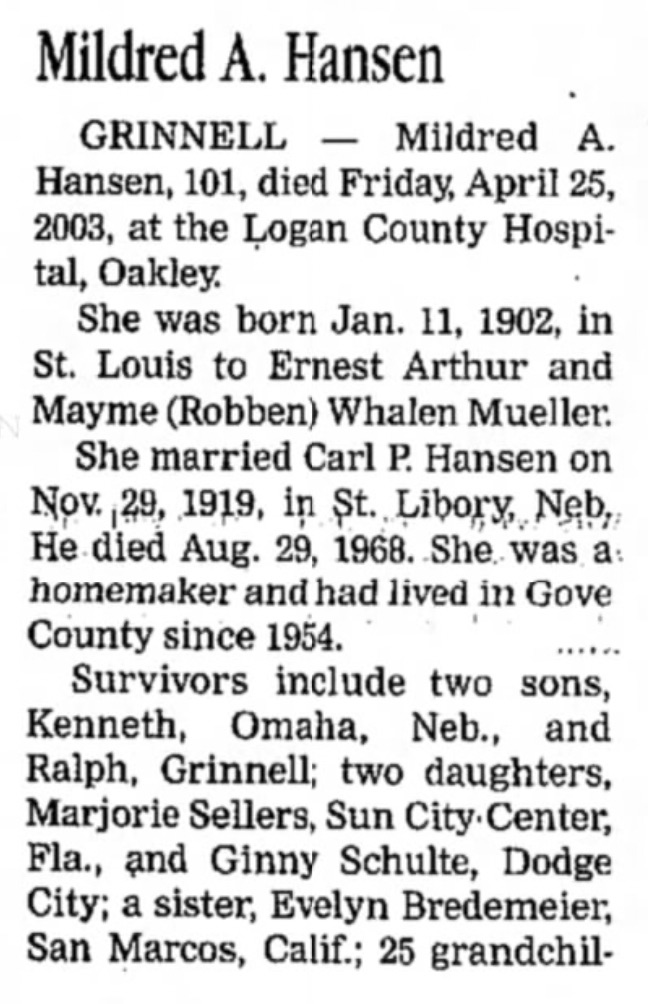 Mayme Adelaide Robben, b. 20 Dec 1879, St. Louis,,(City of St. Louis),Missouri,USA d. 24 Apr 1973, Quinter,,Gove County,Kansas,USA (Age 93 years) |